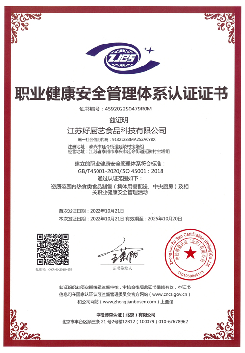 职业健康安全管理体系认证证书